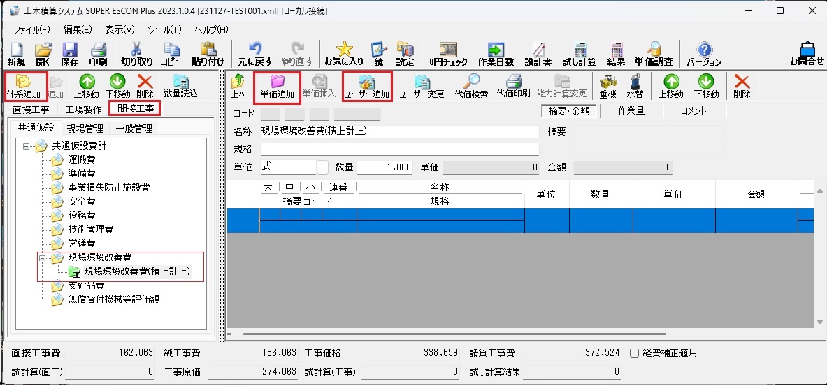共通仮設費率の現場環境改善費の積み上げは、「間接工事」の「共通仮設」タブ→「体系追加」で現場環境改善費(積上計上)を作成。「単価追加」や「ユーザー追加」で積み上げてください。