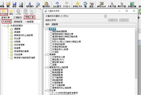 メイン画面左のツリービューで「直接工事」タブを「間接工事」タブに変更し、「共通仮設」タブを選択します。「体系追加」ボタンで工種を作成し積み上げてください。
