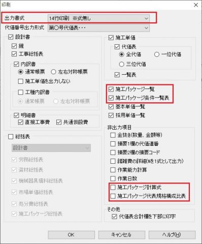 出力書式の選択で「式無し」を選択し、施工パッケージ一覧にチェックを付けて実行すると「施工パッケージ表」シートに詳細が出力されます。「式有り」では施工パッケージ表は出力されません。