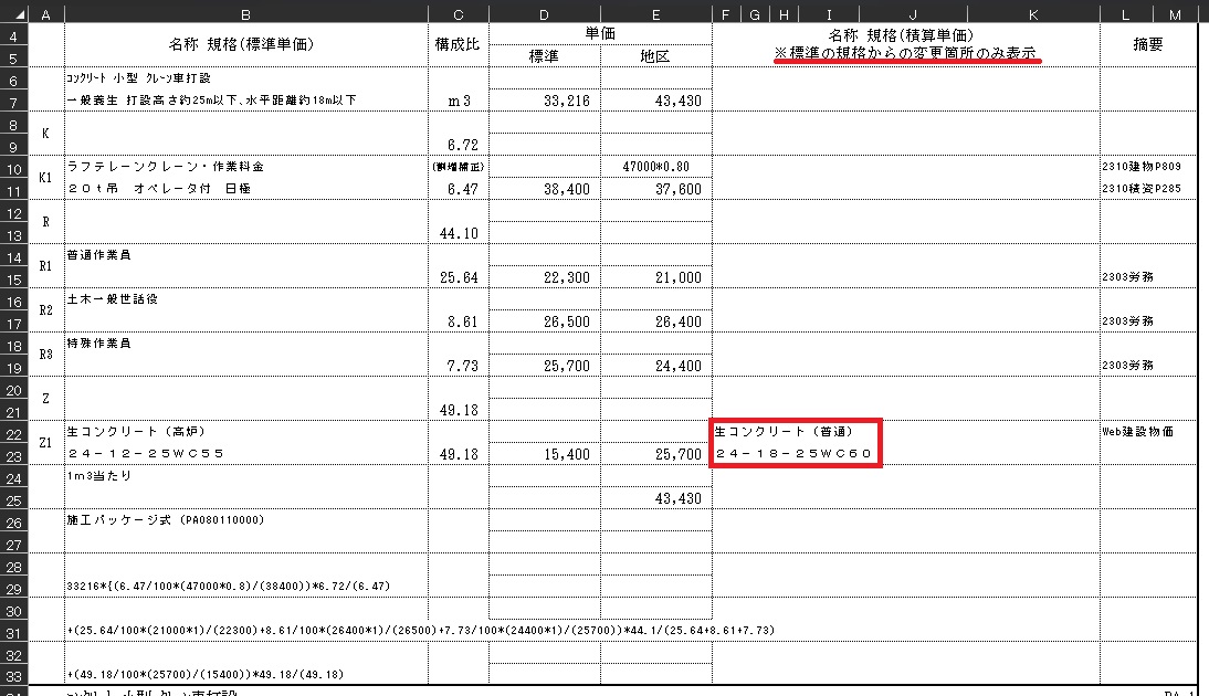 EXCEL出力で施工パッケージのコンクリート規格などの詳細はどこに出力されるのでしょうか。