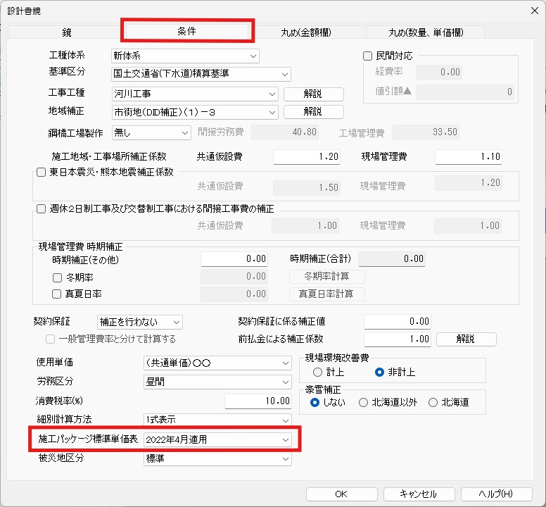 「鏡」⇒「条件」⇒「施工パッケージ標準単価表」を変更してください。