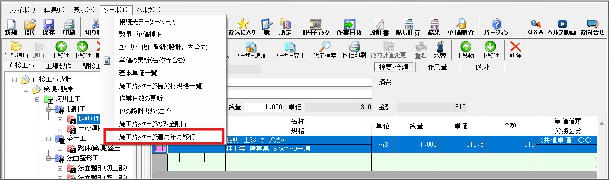 ①「ツール」⇒「施工パッケージ適用年月移行」を選択。