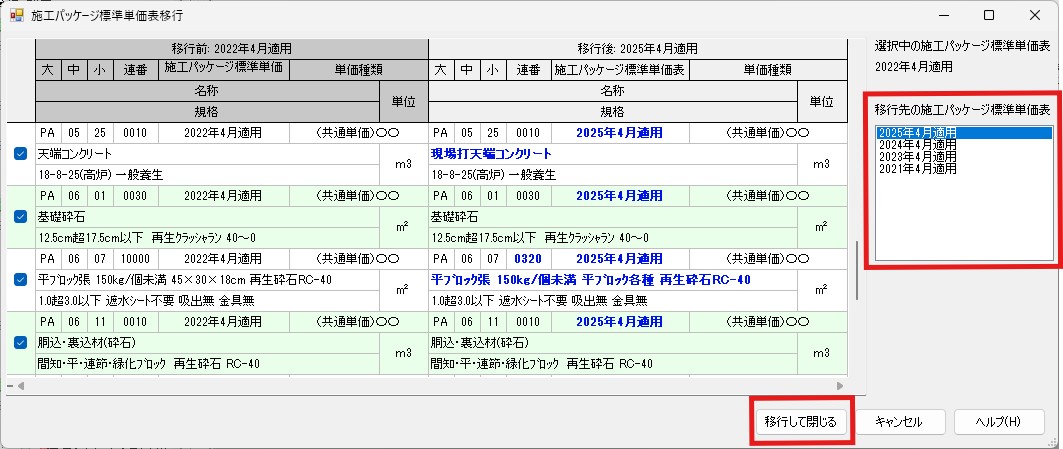 ②移行先の施工パッケージ標準単価表を選択する。(右側白い枠内・選択すると青く反転します)