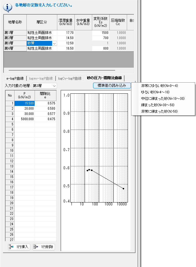 砂の圧力-間隙比曲線にある「標準値の読み込み」ボタンはどんな機能ですか?
