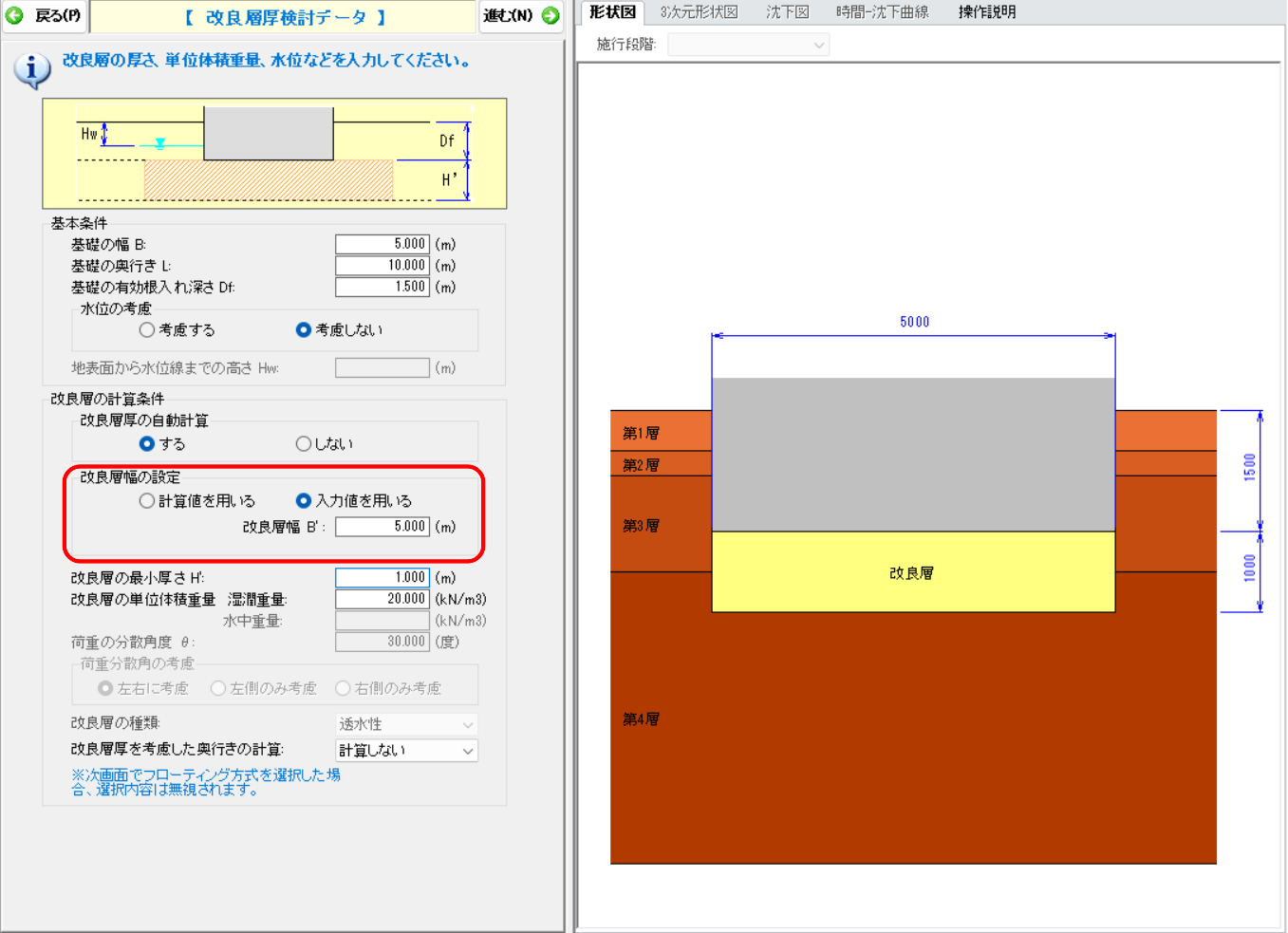 入力画面>改良層厚検討データ>"改良層幅の設定"で、「入力値を用いる」を選択し、改良層幅B’の値を入力してください。