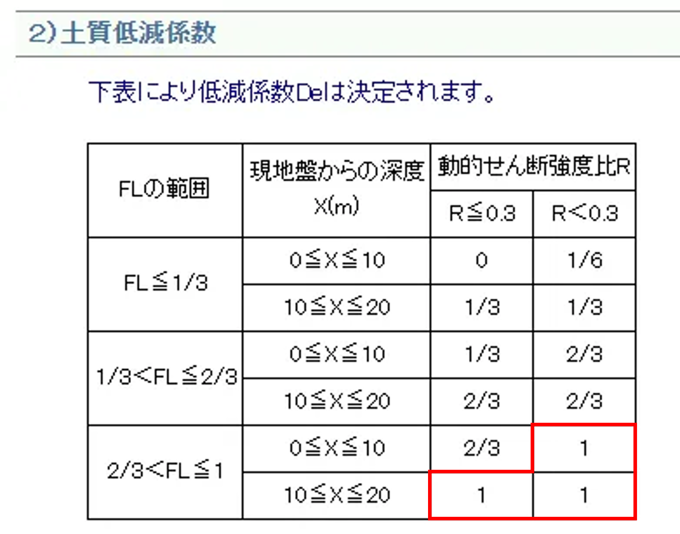 土質定数低減係数Deは、FL値、現地盤からの深度X(m)、動的せん断強度比Rから求まります。下記の表を参照して下さい。また、FL>1(FL値が1より大きい)場合は該当せず、De=1となります。