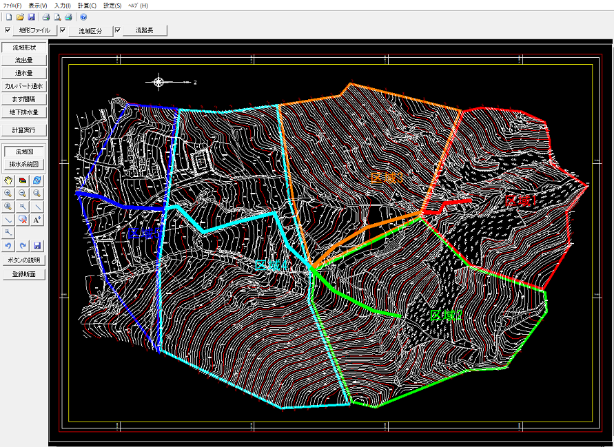 排水設計は、地形データを取り込み、集水区域の設定により集水面積・流路長を算出し、または直接入力することで雨水流出量の計算を行います。