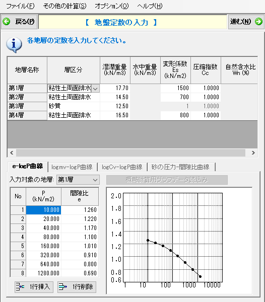 • 圧密沈下量はe-logP法・mv法・Cc法による計算ができます。
