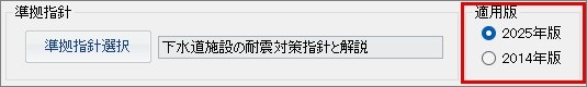 基本条件の準拠指針「下水道施設の耐震対策指針と解説」について、2025年版と2014年版の選択が可能です。