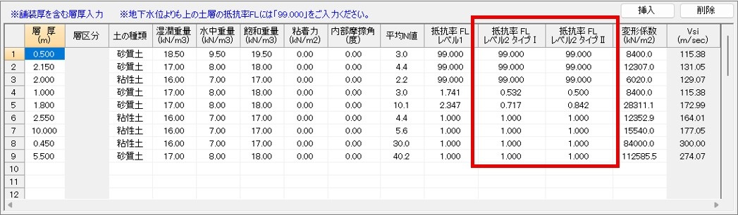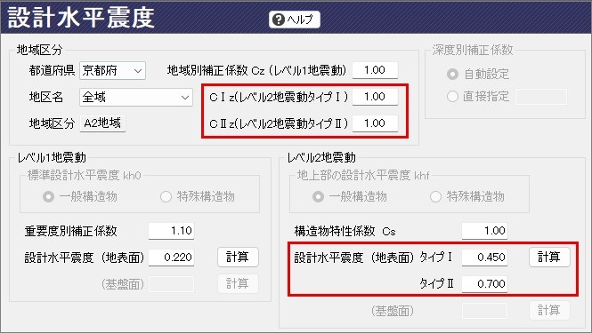 - 設計水平震度の標準値Kh0:タイプⅠ、タイプⅡの入力が可能です。