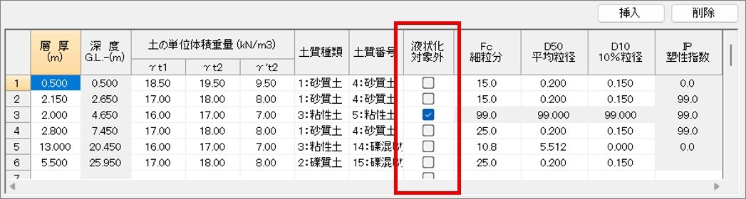 2025年版(道示29年版)を選択した時、粘性土層であっても液状化の発生が疑われる場合は、地盤定数の「液状化対象外」のチェックを外す事で液状化の判定を行う事が可能です。