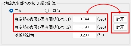 継手部の検討における「地盤急変部での抜出し量の計算」の「急変部の表層の固有周期」に計算ボタンを設けました。