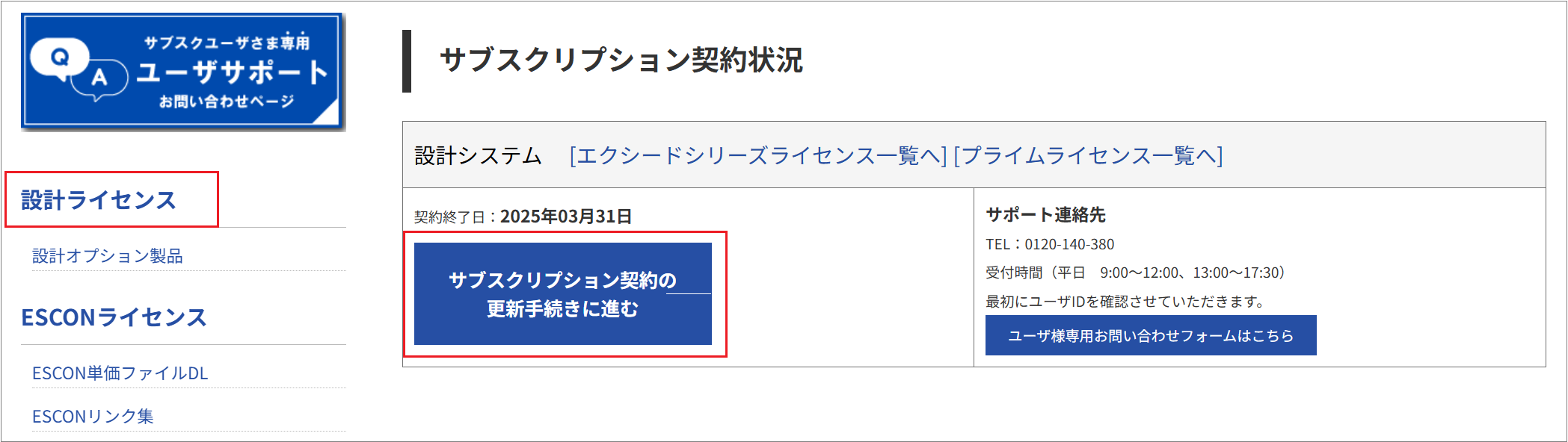 1. マイページにログインし、左メニューの設計ライセンスから「サブスクリプション契約の更新手続きに進む」をクリックします。