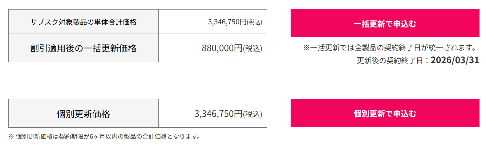 個別更新価格は、サブスク期限が6カ月以内の製品の合計価格となります。