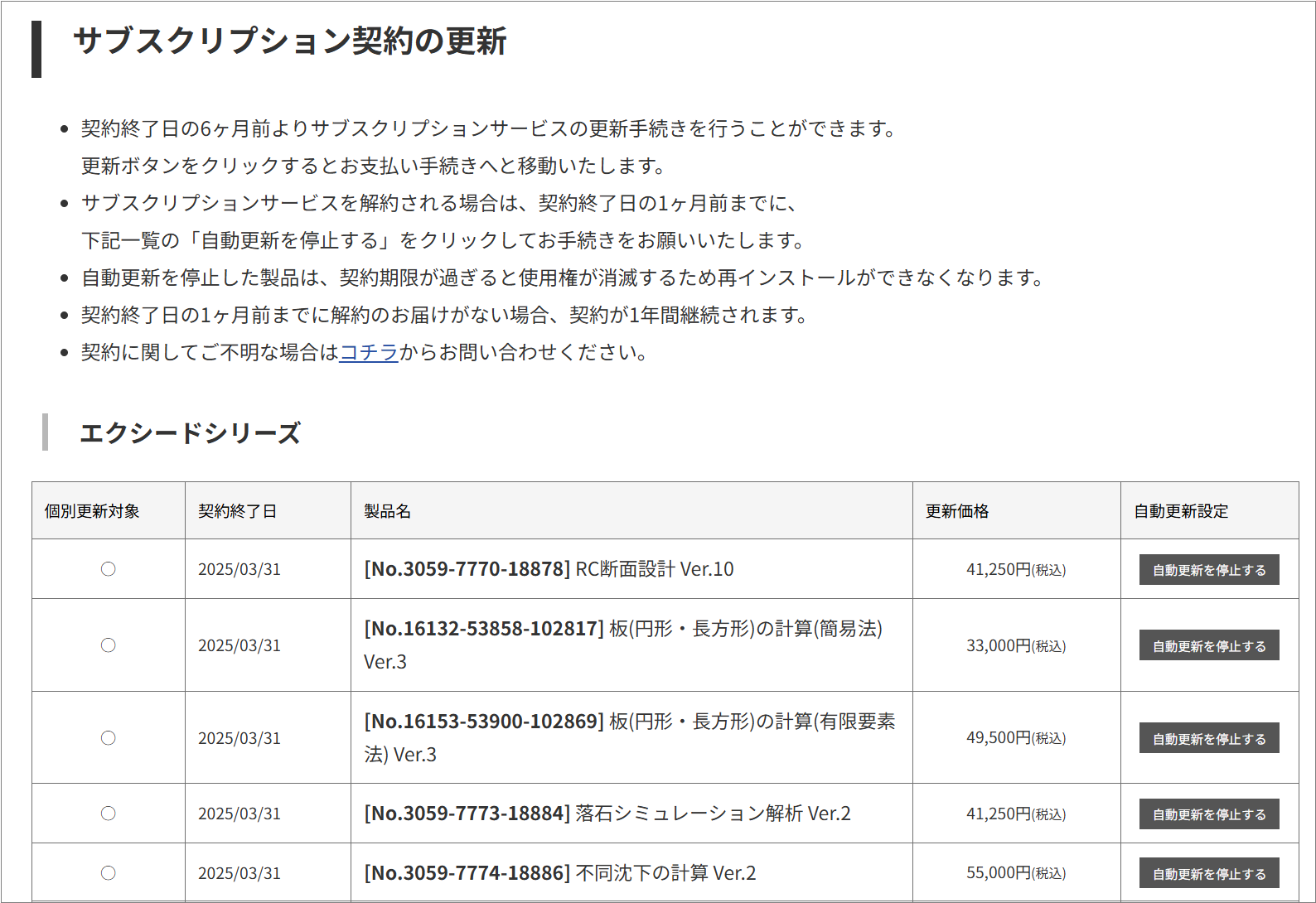 2. 「サブスクリプション契約の更新」ページから、自動更新停止設定および更新手続きが可能です。