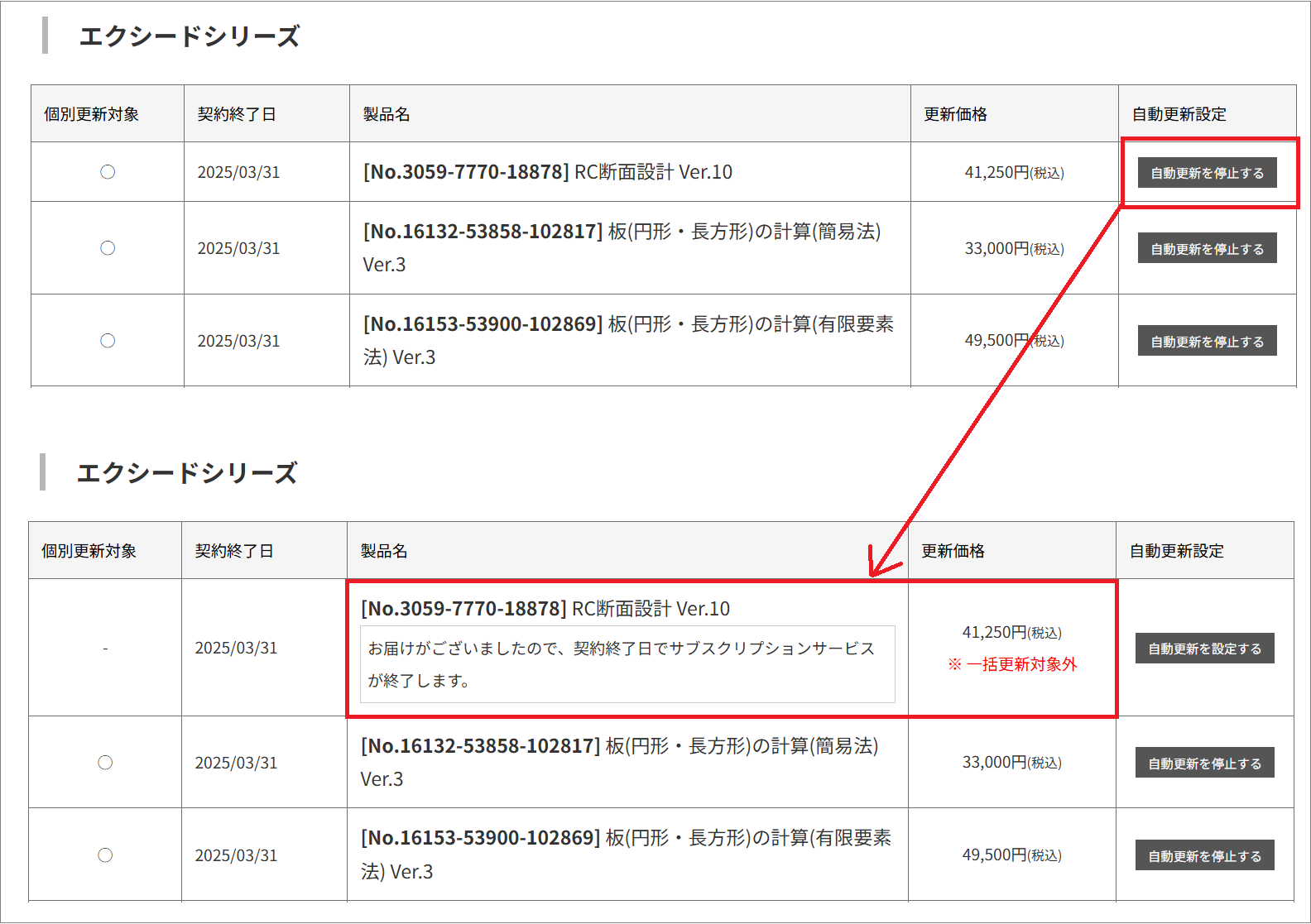 更新対象製品一覧にある「自動更新を停止する」をクリックすると契約終了日でサブスクリプションサービスが解約となります。