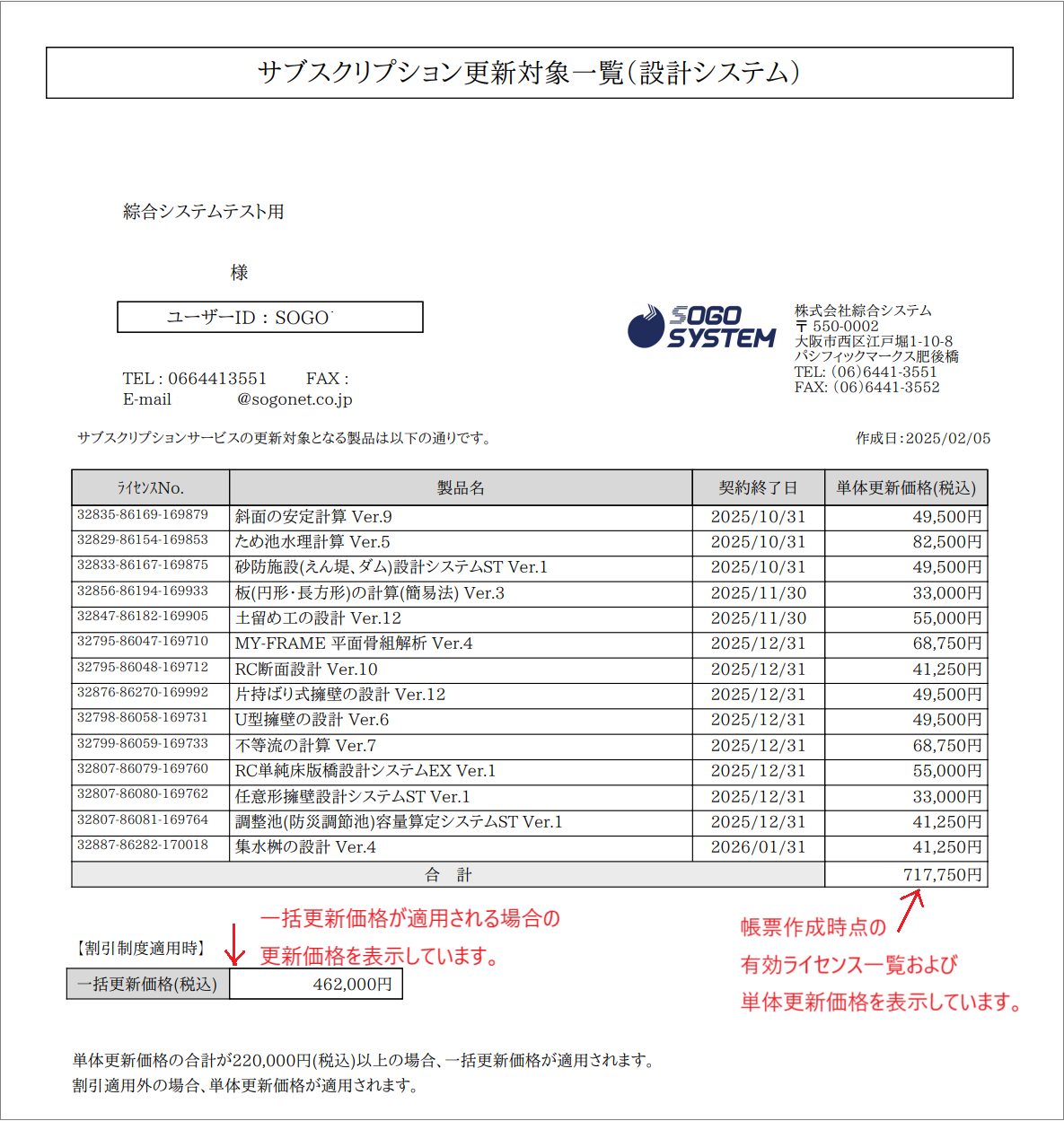 3. 契約製品の一覧表の下に「サブスク対象製品の単体合計価格」「割引適用後の一括更新価格」等が確認できます。