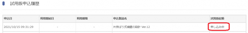 (ご登録のアドレスへ「試用版お申込受け付け」のメールが送信されます。) - 再度、ページ上部の[試用版]を押すと「試用版申込履歴」に[申し込み中]と表示がされます。